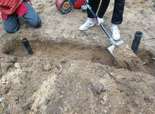 На данном участке изначально присутствовал только простой бетонный памятник и металлическое ограждение. Нам же необходимо было привести территорию могилы в полный порядок. Приступая к работе, мы первым делом вкручиваем определяющие фундамент сваи.
