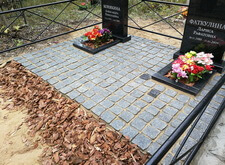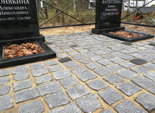 После создания основания мы покрыли территорию места захоронения гранитной брусчаткой, параллельно с этим установив заранее изготовленные памятники и цветники. Затем вернули на место металлическое ограждение и засыпали цветники и площадь перед брусчаткой корой. Этап работ на снимках не отображён, однако на приведённых ниже фото отлично виден итоговый результат.